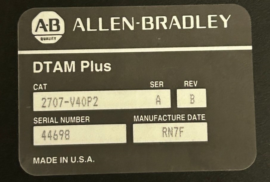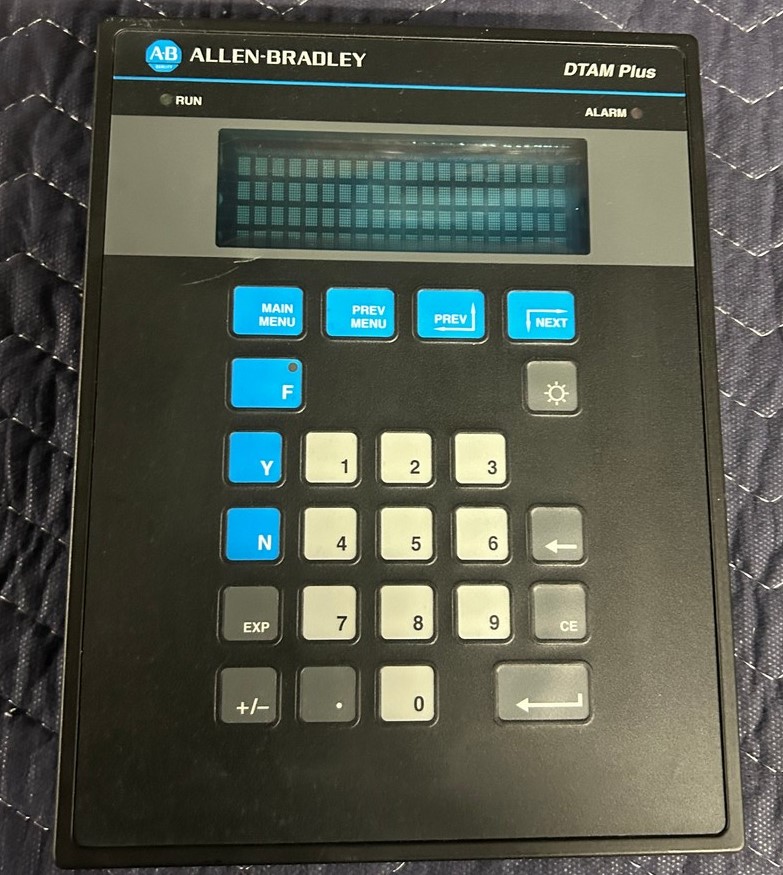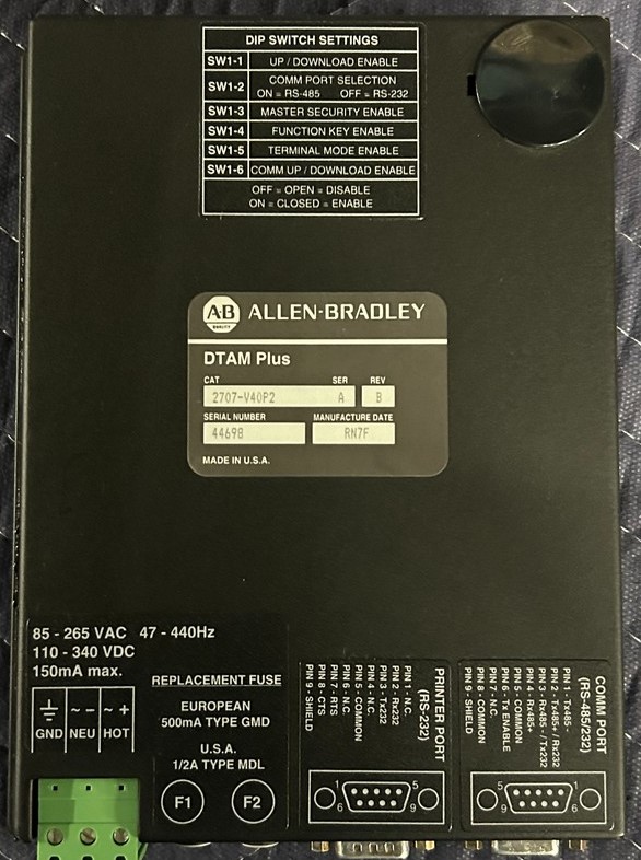 The Allen-Bradley DTAM Plus Data Terminal (Cat. 2707-V40P2) is an industrial operator interface/HMI module that lets operators monitor and control PLC and automation systems from the plant floor. It features a 4-line × 20-character VFD display, RS-232/RS-485 communication ports, onboard memory, and function keys for intuitive interaction with Allen-Bradley PLCs and SLC controllers.